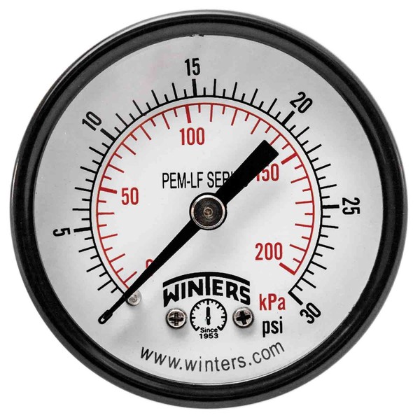 Winters 2 inch Dial Size, Economy Utility Dry Pressure Gauge, Potable Brass Internals, Steel Case, Dual Scale 0-30 psi/kPa, 3-2-3% Accuracy, 1/4 inch NPT Back Mount, Drinking Water Pressure Gauge
