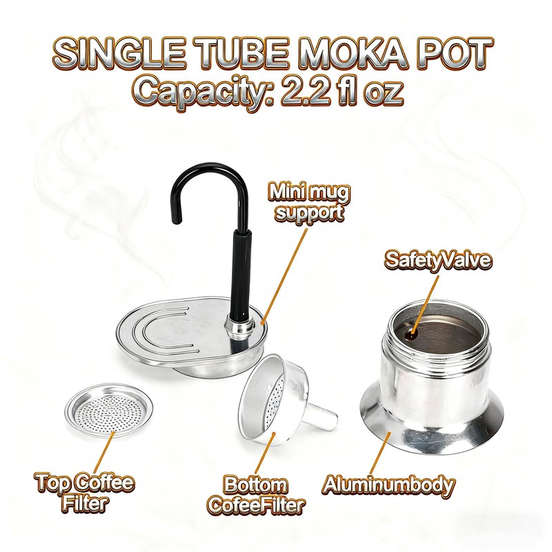 - CAPACITY: Compact 50ml (1.7 oz) single-serve mocha pot, perfect for brewing one cup of rich Italian-style coffee