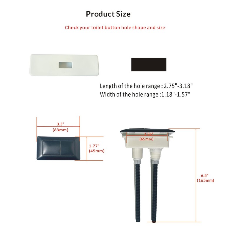 - ✅ Square / rectangular design:The current button is rectangle shaped, compatible for rectangular button hole in the tank lid, please measure the hole size as per the 5th picture. Please check the shape and size of the button hole on your toilet. This will ensure that the button is compatible with your toilet and will fit properly. Please take the time to measure and verify the button hole shape before making your purchase.
