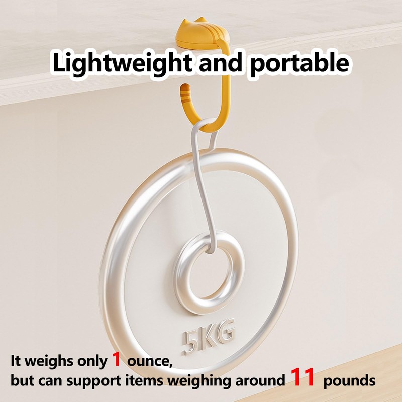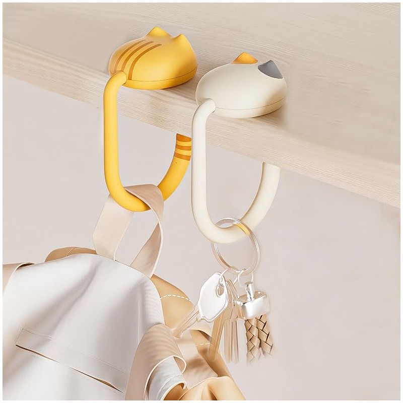 - Design features: Package include 2 desk bag hooks,one yellow and one white.This purse hanger for table product adopts a cute cat shaped design, which is not only practical but also adds fun to the home environment. The tail and other details of the cat have been carefully designed to make it look lifelike