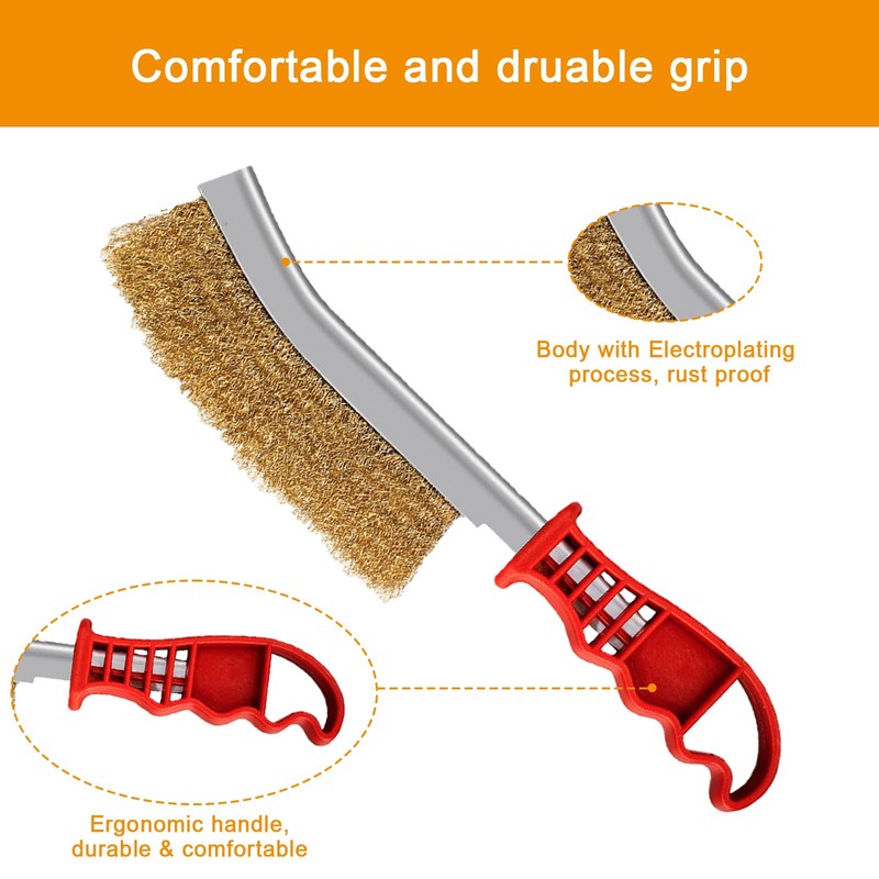 - 👉 Brush heads -- The brass brush head is moderately soft and hard, the steel wires with a diameter of 0.3 mm are tightly arranged and have a strong cleaning effect, which is suitable for cleaning grill residues and grease. The wave-shaped plastic handle corresponds to ergonomics, is non-slip and does not hurt the hands