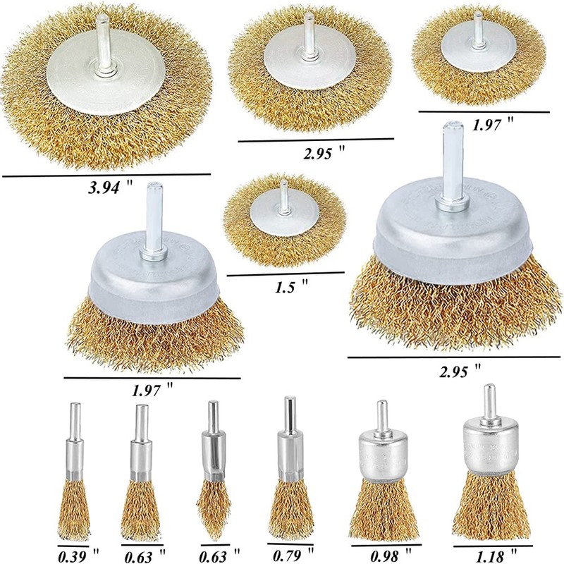 - WHAT YOU GET - 4-pack wire wheel brushes(1.5”, 1.97”, 2.95”, 3.94”), 2-pack wire cup brushes(1.97”, 2.95”), 6-pack wire end brushes(0.39”,0.63”,0.63”,0.79”,0.98”,1.18” ). Enough for your daily use and replacement.