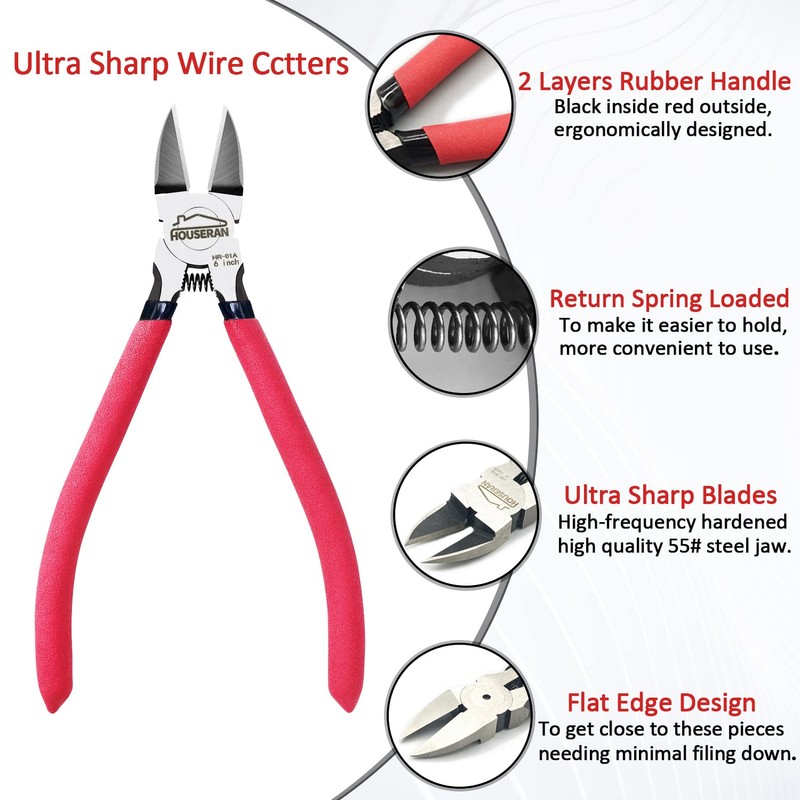 Wire Cutters, 6 inch Side Cutters, HOUSERAN Dikes Wire Cutters Diagonal Cutters with Non-Slip Red Handle, Flush Cutter Pliers, Wire Clippers, Spring Loaded Wire Cutters for Jewelry, Crafting, Zip Tie