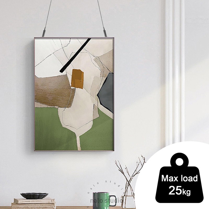- HIGH LOAD CAPACITY Each steel rope has a maximum load capacity of 25kg and is equipped with sturdy hooks, which can securely hold heavy frames and large objects without bending or breaking. So you can display your valuable items safely and stably.