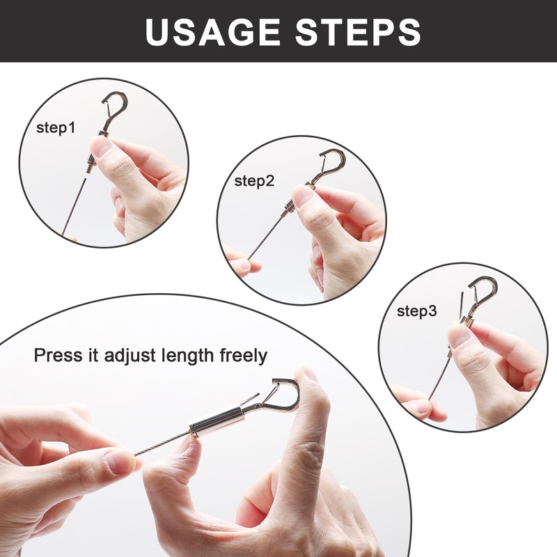 - EASY TO INSTALL AND ADJUST The wire rope kit is easy to install and is ideal for DIY enthusiasts. By simply pressing and pulling, you can adjust the length of the tension wire without tools to change the height of your pictures or objects quickly and effortlessly.
