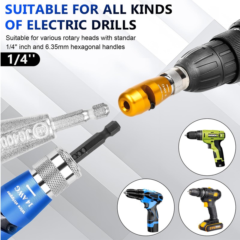 - 【CraftSmanship】The wire stripper is made from high-quality zinc alloy, while the twisting tool is crafted from 40CR forged steel using a high-temperature extrusion process, making it harder, more wear-resistant, and better at withstanding heat. The wire caps are made from insulated, flame-retardant nylon, effectively preventing electrical leakage. Built to withstand the rigors of everyday use. It's compatible with most drill bits and features a 6mm hex shank, making it suitable for use with standard 6mm hex drill chucks, electric screwdrivers, power wrenches, and other power tools.