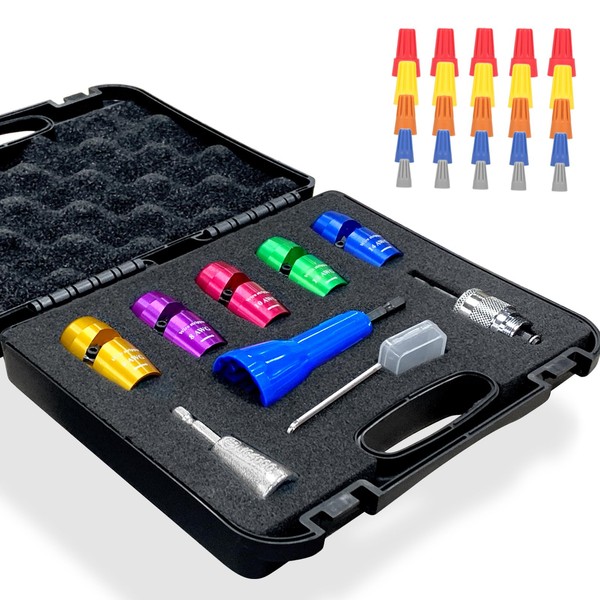 - 【Package contents】Our new upgraded wire stripping and twisting tool set,including wire strippers * 5,wire stripper connecting rod * 1,replacement blade * 1, Wire cap screw collector *1,L-shaped hexagonal wrench * 1,1/4" silver Wire twister tool * 1,P1, P2, P3, P4, P6 size of wire caps * 5 total 25pcs,Instruction sheet * 1. Designed to handle stripping, paralleling, insulation, and other tasks, this tool makes your work easier and faster compared to traditional manual wire strippers. Using this electrical tool set will significantly boost your work efficiency.