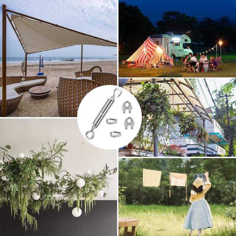 - Wide application: wire rope tensioner kit can be used for tensioning awnings, drying clothes, attaching tents and outdoor lamps and can also be used in a variety of outdoor environments such as cable railings can be used on decks. It is suitable for personal home use, but also for outdoor enthusiasts and camping enthusiasts.
