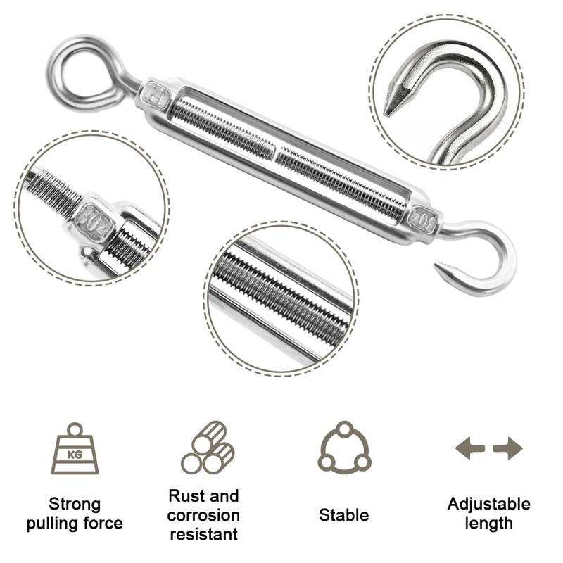 This stainless steel turnbuckle set is made of high-quality 304 stainless steel, which has good rust and corrosion resistance and can be used for a long time without rust or damage, which ensures the stability and durability of the product.