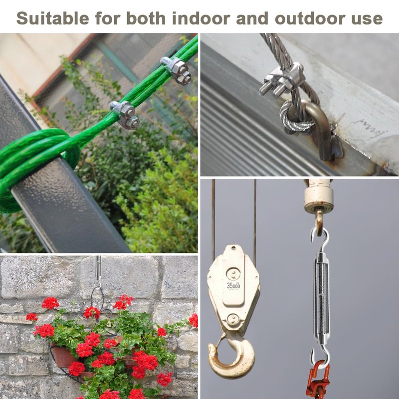 This wire rope clamp set is suitable for installing washing lines and can also be used frequently for attaching sun protection curtains, tent ropes, outdoor lamps and wire rope railings. Suitable for outdoor camping, relaxing in the garden and home use.