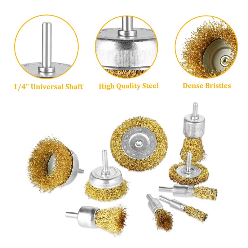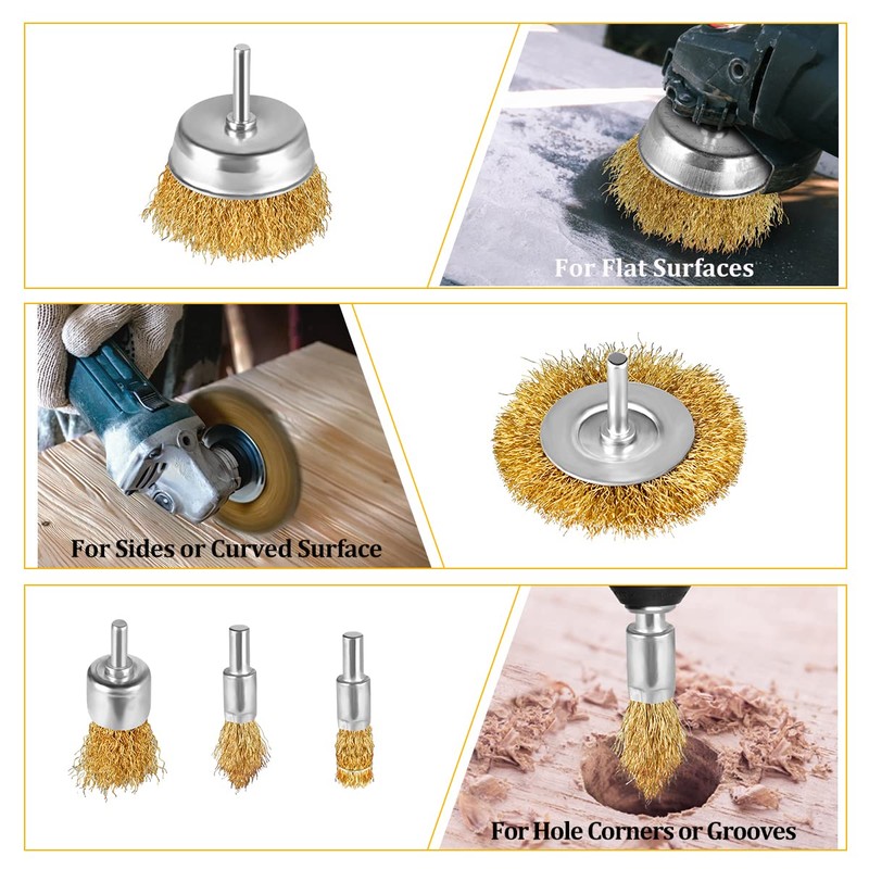 - 【Wide Application】The wire wheel brush set removes rust, paint, dust and burrs from surfaces such as metals and wood, and can also be used to level weld spatter.