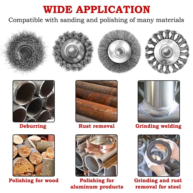 - Widely Applicated: The variable size and style combination will meet both light duty and heavy duty works on metals & woods and so on,fit to remove weld scale/spatter/rust/paint and heavy corrosion. Wildly used for peeling and grinding the metal surface as well as the surface treatment before painting or electroplating.