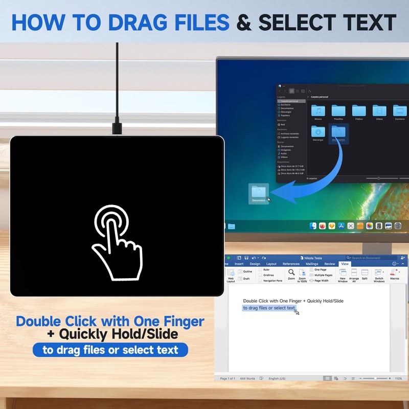 - How to Drag Files & Select Text: Double Click with One Finger+Hold/Slide to drag files or select text. Please try quickly double-tapping the trackpad with one finger, then keep holding and sliding to drag files or select a paragraph of text or a row of cells. Please kjindly note the holding and sliding should following the double-tapping very quickly, otherwise, this function will be open files.