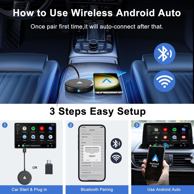 • 【Wireless Android Auto Plug and Play】 wireless android auto car adapter plug and play, no need to install any additional apps. Steps: 1. Plug the adapter into your car’s USB/USB C port. 2. Activate Bluetooth and WiFi on your phone and receive Bluetooth connection data for pairing. 3. Wait for the prompt and select ""Use Android Auto."" After first setup, Android Auto will connect seamlessly with your phone the next time you start your car.