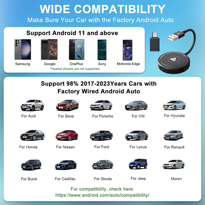 • 【Wireless Android Auto Wide Compatibility】 This wireless Android Auto works on Android 11 and above smartphones like Oneplus, etc. Wireless Android Auto Adapter is only compatible with (2017-2024) cars equipped with factory wired Android Auto. Note: (Only compatible with Android Auto, not suitable for any other system).