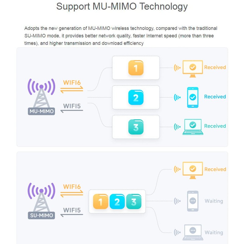 - Support MU-MIMO Technology: Adopts the new generation of MU-MIMO wireless technology, compared with the traditional SU-MIMO mode, it provides better network quality, faster Internet speed (more than three times), and higher transmission and download efficiency