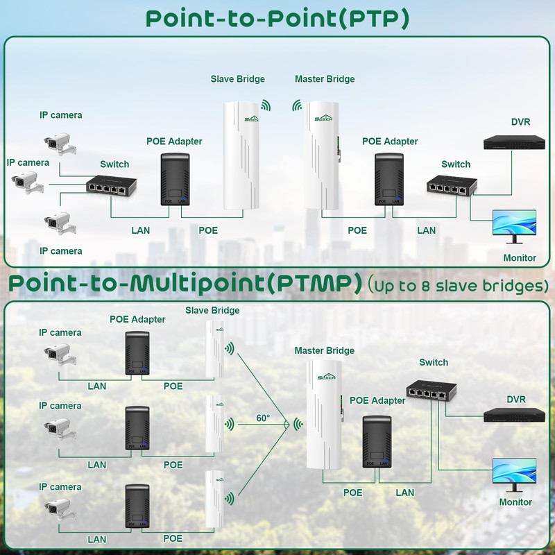 - 【5.8GHz Wireless Technology】The point-to-point wireless bridge adopts 5.8GHz wireless technology, which has strong anti-interference ability, good stability, high scalability and flexibility, and can meet 8 non-overlapping channel deployment. The wireless transmission speed (wireless bridge A to B unit) of this outdoor wifi can reach 900Mbps, and the maximum LAN network transmission speed (POE adapter to wireless bridge connection) is 433Mbps.
