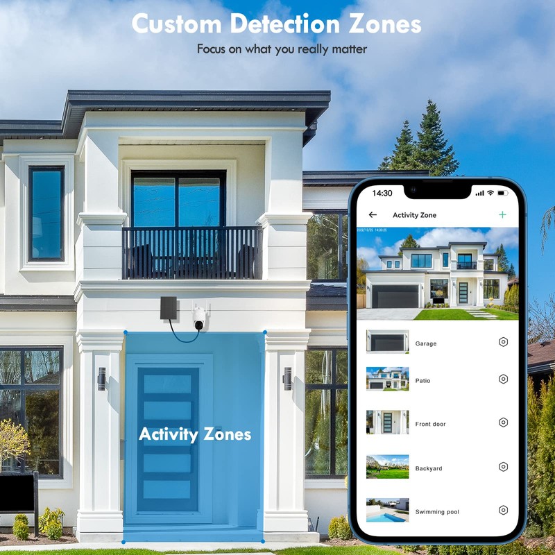 - AI Motion Detection & Two-Way Audio - Advanced AI recognition technology support customize the monitoring area and target in the "VicoHome" APP to distinguish between people, pets, vehicles, or receiving packages, providing higher accuracy. This outdoor camera built in the speaker and mic-phone, you could talk to delivery man when he aright your home, ask kids for lunch, volume adjustable.