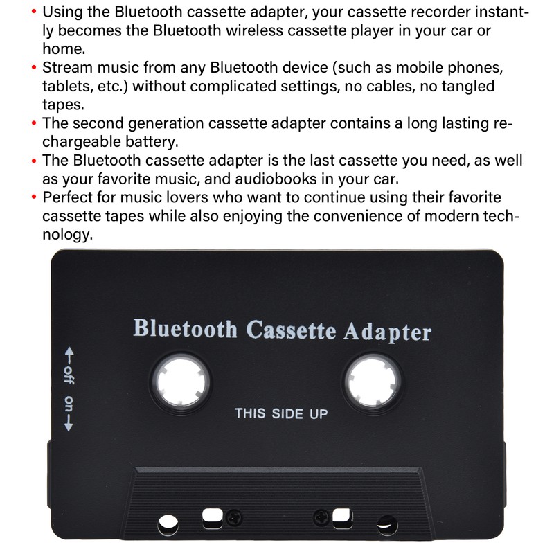 1、Application: Using the Bluetooth cassette adapter, your cassette recorder instantly becomes the Bluetooth wireless cassette player in your car or home. 2、Wireless: Stream music from any Bluetooth device (such as mobile phones, tablets, etc.) without complicated settings, no cables, no tangled tapes. 3、Charging: The second generation cassette adapter contains a long lasting rechargeable battery. 4、Practical: The Bluetooth cassette adapter is the last cassette you need, as well as your favorite music, and audiobooks in your car. 5、Convenient: Perfect for music lovers who want to continue using their favorite cassette tapes while also enjoying the convenience of modern technology.