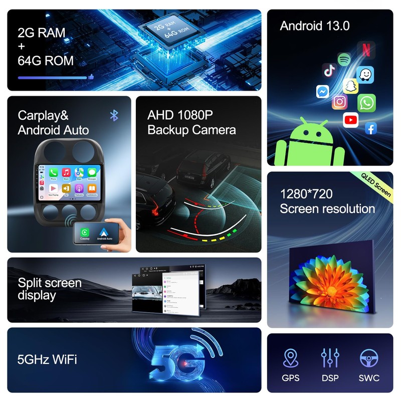 - 【For Jeep Compass Radio Performance】 Android 12 OS + 2GB RAM runs Waze/Spotify at 60fps 64GB storage for offline maps & music library Tested on Jeep Patriot 2010-2016 models