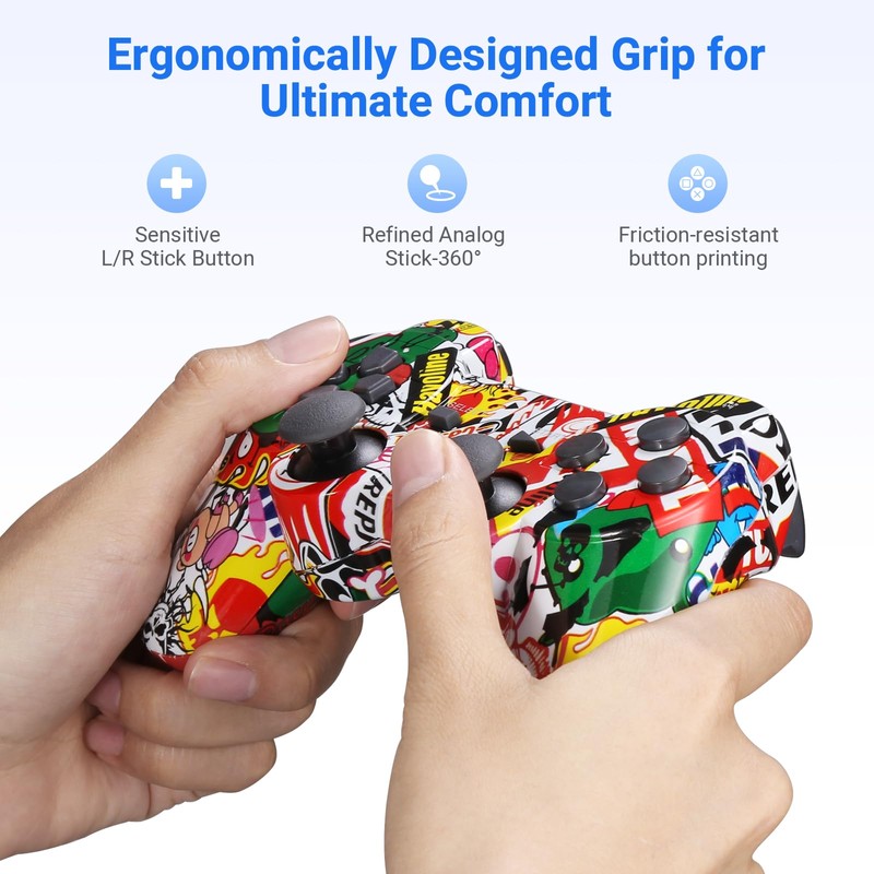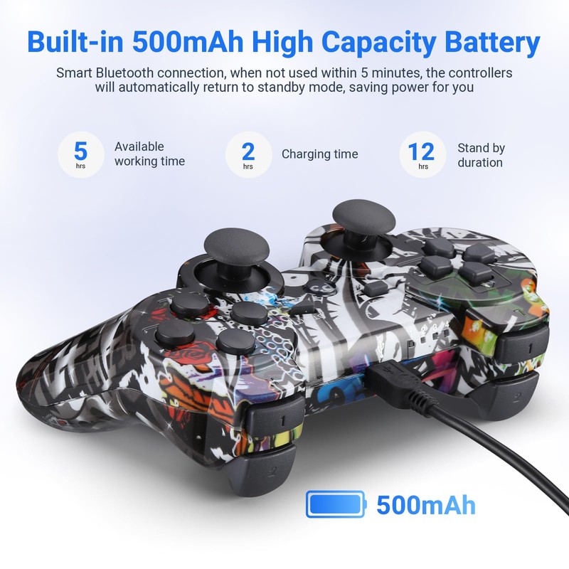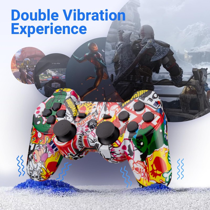 Wireless Controller for PS-3,2-Pack Rechargable Remote Controller with 2 x Charging Cables for PS-3, High Performance Ergonomically Designed Grip, Double Vibration, Bluetooth, No Stripes(Graffiti Look)