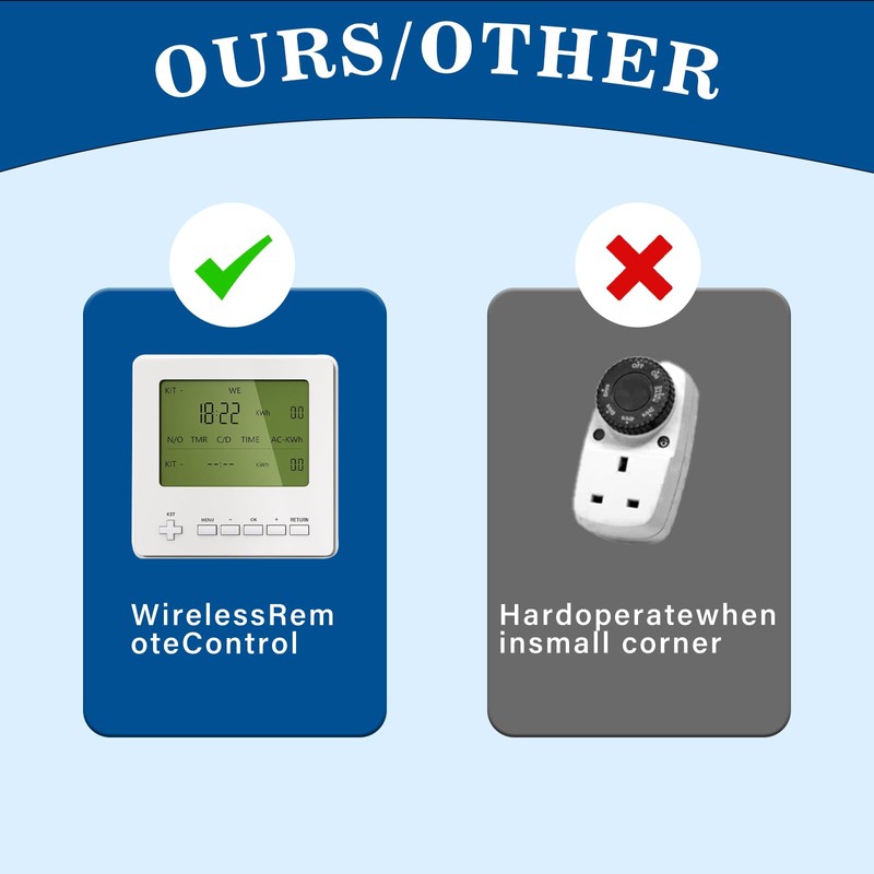 - Wireless remote control: the wireless range between the control meter and the plug can reach 30 metres. The socket can be used for household appliances in any corner of the area. It is easy to control the socket switch via the control meter, which is convenient to use and effectively avoids the difficulties of use caused by the hard-to-reach location of the device.