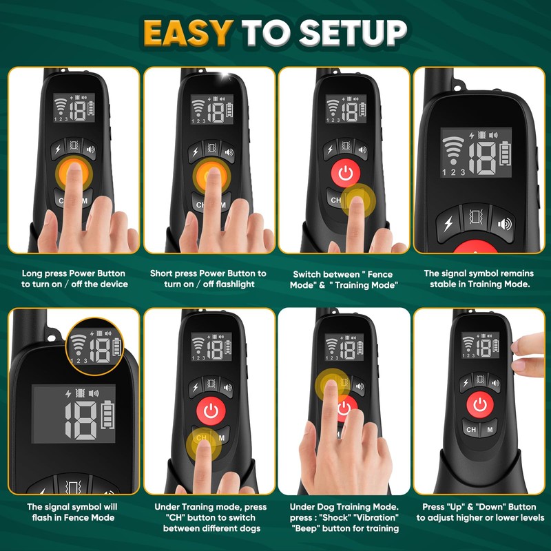 - 【Wireless Fence Mode】 With the wireless fence mode, one transmitter can connect with multiple collars automatically, The signal range from 50ft extends up to1640ft in radius, and when your dog goes beyond this range, the receiver collar will emit a warning tone followed by a vibration then a mild electrostatic shock (3.7V low voltage) to gently remind them to return. Say goodbye to traditional boundaries and allow your dog to roam safely within the designated area.
