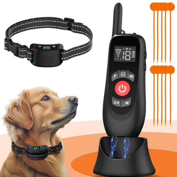 - 【Thoughtful & Safe Design】The wireless transmitter boasts a handy strap for easy portability and a built-in flashlight for nighttime assistance. The electric fence collar is adjustable, fitting dogs with neck sizes ranging from 8 to 28 inches and accommodating weights between 10 and 110 pounds. It includes four conductive contacts: two small for short-haired dogs and two large for long-haired dogs. Additionally, four silicone caps provide extra protection. Crafted from reflective fluorescent TPU, the electric collar enhances your dog's nighttime visibility and safety. With an IP67 waterproof rating, your dog can play in the rain or roll in wet grass without any worries.