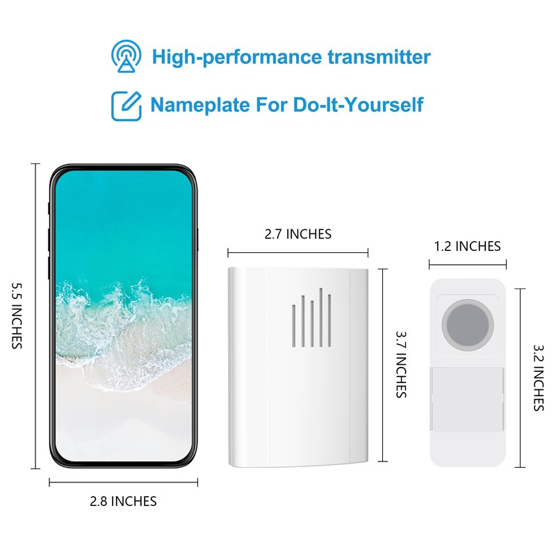 - Easy Installation: The wireless doorbell receiver is powered by 3 AA batteries, no outlets need to be occupied. Fix the doorbell transmitter on the wall or door with the provided double-sided tape. And the DIY nameplate on the door bell push button can also surprise visitors