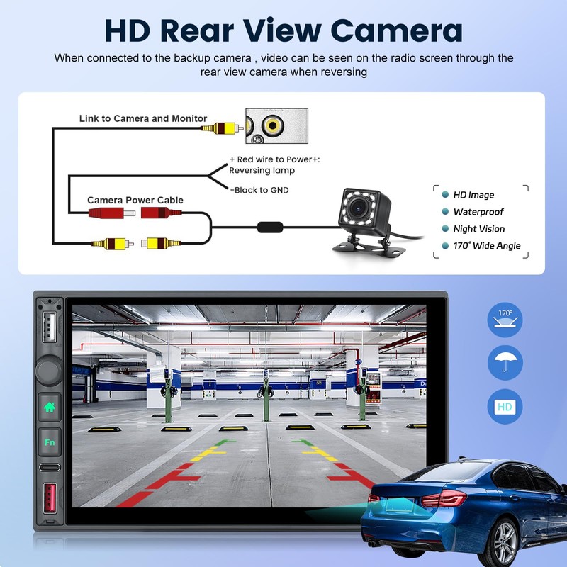 - Rear View Camera and 2 USB Ports: This machine is equipped with HD night vision rear view camera, 170° ultra-wide viewing angle, IP68 grade full waterproof design, no matter day or night, parking safer and easier. The camera has two USB ports, one can insert USB flash drive, the other can be charged, the unique charging function can make your charging speed increase several times!