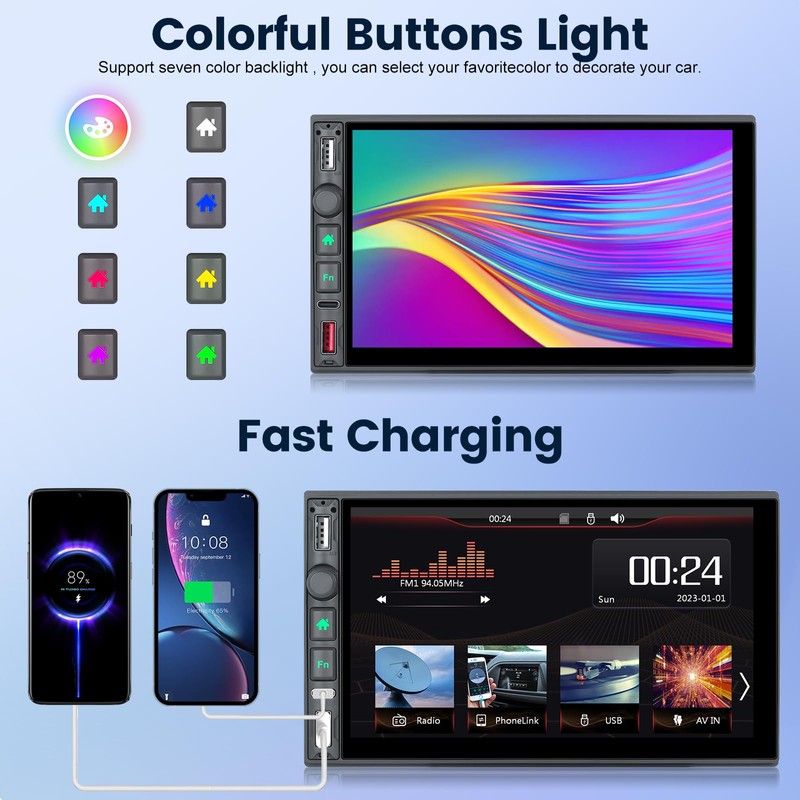 - Mirror Link and HD Screen with Panel Function Buttons: Mirror Link support for IOS and Android phones (no version limitation) allows you to mirror your smartphone's screen using a USB connection, displaying maps, Spotify, Youtube, and more on a large screen. 7-inch HD touchscreen with 1024 X 600 resolution supports 1920 X 1080P video playback. Physical buttons make it easier to use while driving, especially the rotary volume control.