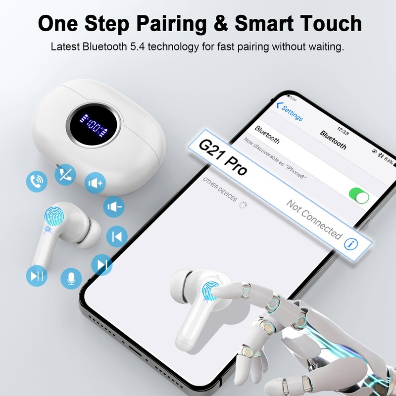 - 【2025 Upgraded Bluetooth 5.4 with 0.1s Ultra-Low Latency】The Rinsmola G21Pro Bluetooth headphones adds Bluetooth flash pairing technology to the latest Bluetooth version 5.4 for fast pairing in 1 seconds. Compared to the previous version, power consumption is reduced by 40%, signal stability is improved by 60% and interference immunity is increased by 55%. Ensure audio and playback are synchronized for an immersive entertainment experience. After pairing your devices for the first time, your ear buds will automatically connect when you remove them from the charging case.