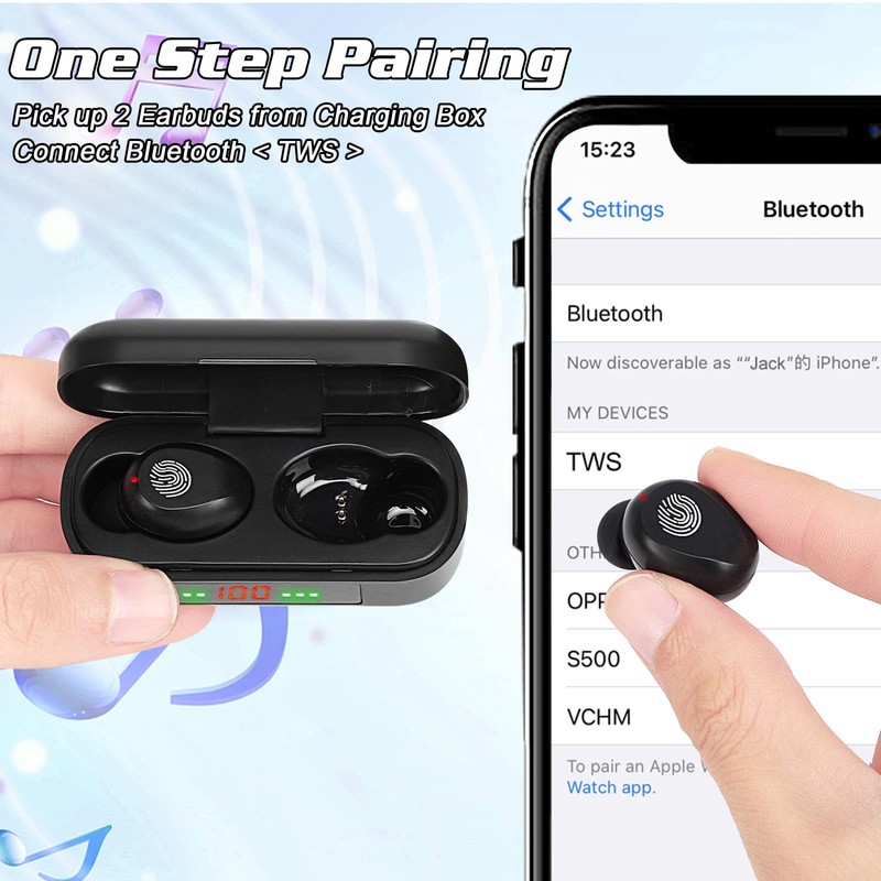 - 【Fast & Stable Connection】Advanced Bluetooth 5.0 technology guarantees faster and more stable connection and transmission. Open the charging case then the true wireless earbuds will turn on and pair automatically. Care-free for pairing problem. When you use single earphone just take out the second one to achieve seamless transformation between single mode and twin mode.