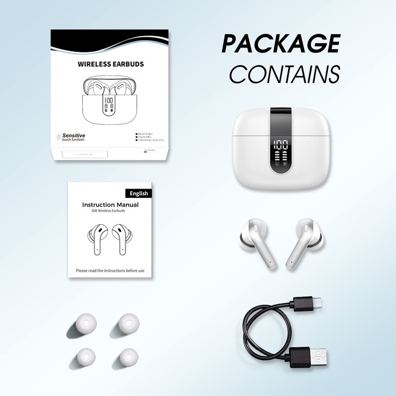 - 50Hrs Playtime & Real-Time LED Display Stay powered all day with up to 8 hours of playtime on a single charge and an additional 42 hours with the compact charging case. The wireless headphones feature a real-time LED display that accurately shows the remaining power of both the earbuds and the case, making them ideal for bluetooth headphones for travel and daily use