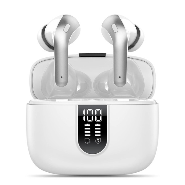 Wireless Earbuds, Bluetooth 5.3 Headphones with 4 ENC Noise Cancelling Mic, Deep Bass, IP7 Waterproof, 50H Playtime, LED Display, in Ear Earphones for Phone, Laptop, Pearl White