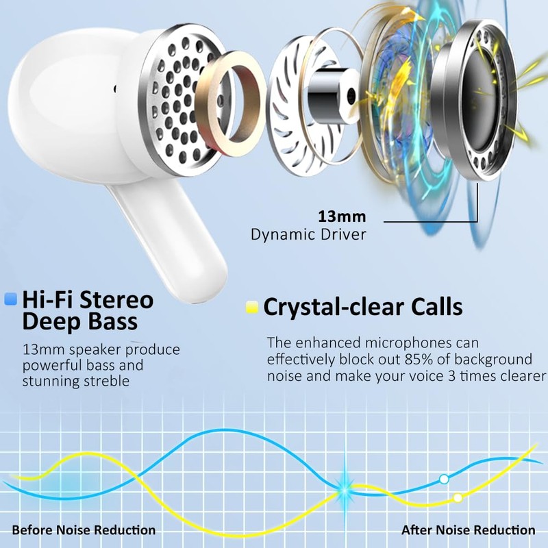 i13 2024 wireless earbud bluetooth with bio-carbon fiber composite diaphragm and polymer TPU of 13mm large dynamic unit, powerful low frequency, delicate and unique mid-high frequency, to create a beautiful sound quality. Accurately capture your voice in real-time, ideal for calls, face time, online meetings.