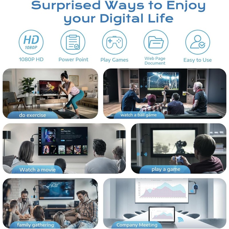 • 【Breite Kompatibilität】 Dieser kompakte und tragbare kabellose HDMI-Display-Dongle-Adapter ist ideal für Geschäftspräsentationen unterwegs. HDMI-Display-Adapter ist mit iPhone, iPad, Android-Geräten, Windows-PCs und MacBooks kompatibel. Dank der Unterstützung von Miracast, DLNA und AirPlay können Sie nahtlos Inhalte von verschiedenen Plattformen auf größere Bildschirme übertragenSein leistungsstarker Chipsatz gewährleistet Kompatibilität mit einer Vielzahl von HDMI-Ausgabegeräten, darunter Laptops, PCs, Blu-ray-Player, Kameras, DVDs, Tablets und mehr. Er ist perfekt für Konferenzräume, Home-Entertainment und Multimedia-Bildung