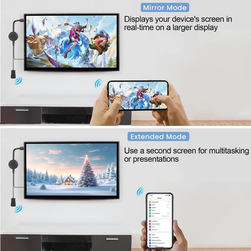 • 【Flexible Screen Change】 Offers two options: mirror mode and extended mode. Mirror mode is suitable for sharing videos, photos and presentations. Advanced mode allows multitasking. In advanced mode, you can turn off the screen or perform other actions after video playback — for uninterrupted entertainment and work. Our 4K wireless HDMI adapter supports horizontal and vertical screens, meeting your different screen requirements.