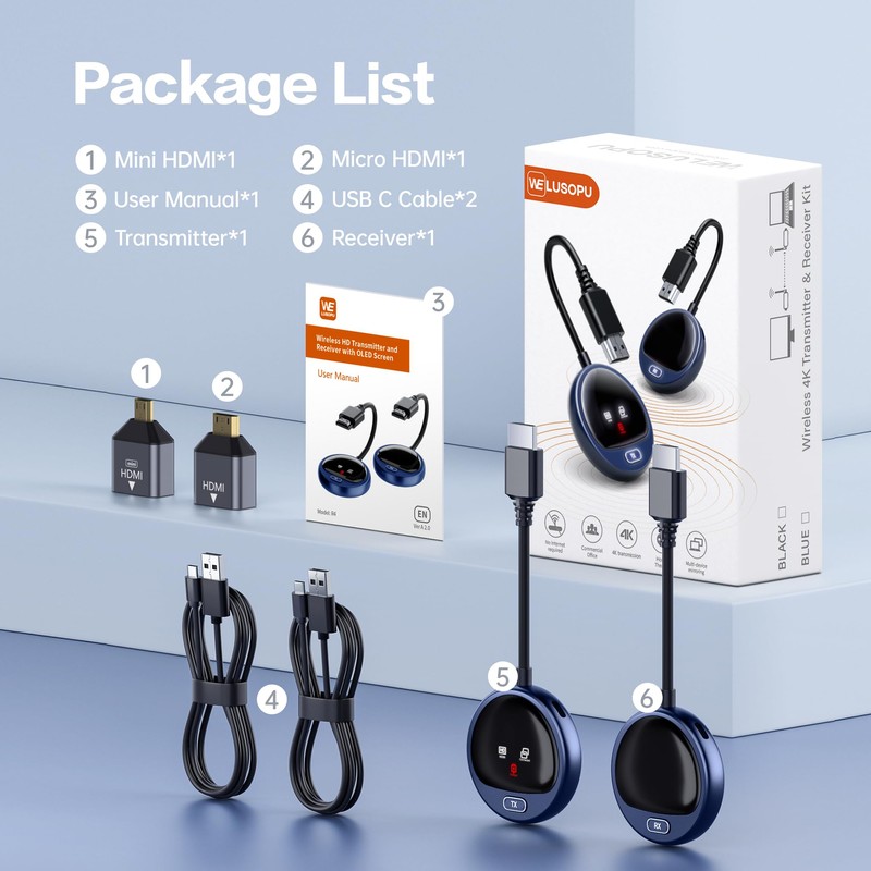 - WELUSOPU wireless HDMI 4K kit package includes 1 x transmitter, 1 x receiver, 2 x power cables, 1 x mini and macro adapter, 1 x user manual (English language not guaranteed), 1 x exquisite packaging. If you encounter any problems during use, please feel free to contact me.
