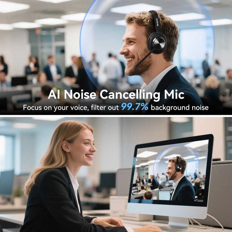 • 1️⃣【99.7% Noise Cancellation】Equipped with AI-driven beamforming technology, this wireless work headset blocks keyboard clatter, cafe chatter, and ambient noise by 99%—ideal for open offices or crowded spaces. Mute function for instant privacy control. Perfect for hybrid work