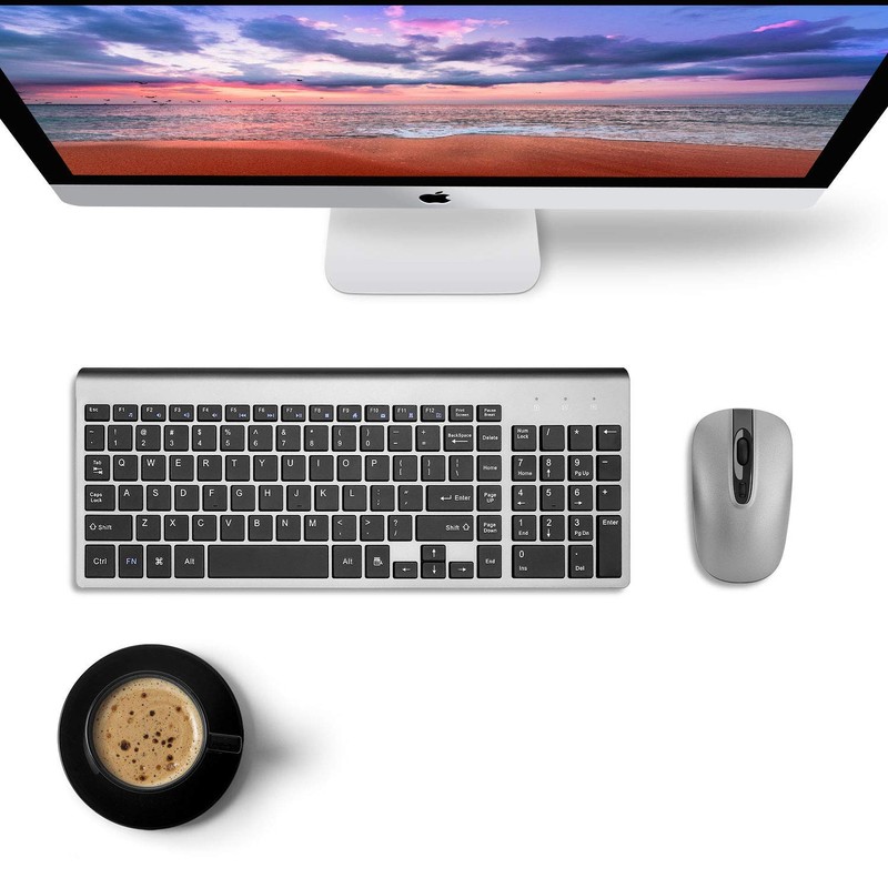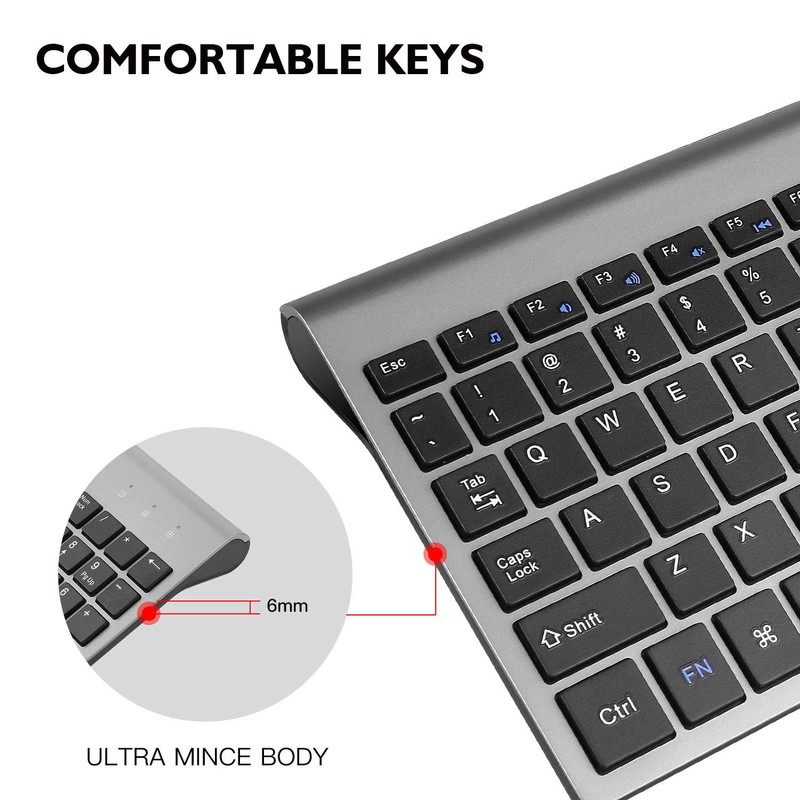 - 【Slim and Ergonomic Design】 The slim wireless keyboard and mouse combo has a tilt angle for the great typing position.Sweat-resistant, skin-friendly finish wireless mouse in contoured shape would provide hours of work comfortably. The full size wireless keyboard type fast with numeric keypad and instant access your music,internet,e-mail,volume,etc by multi-media hot keys.(The hot-keys not fully compatible with Mac System)