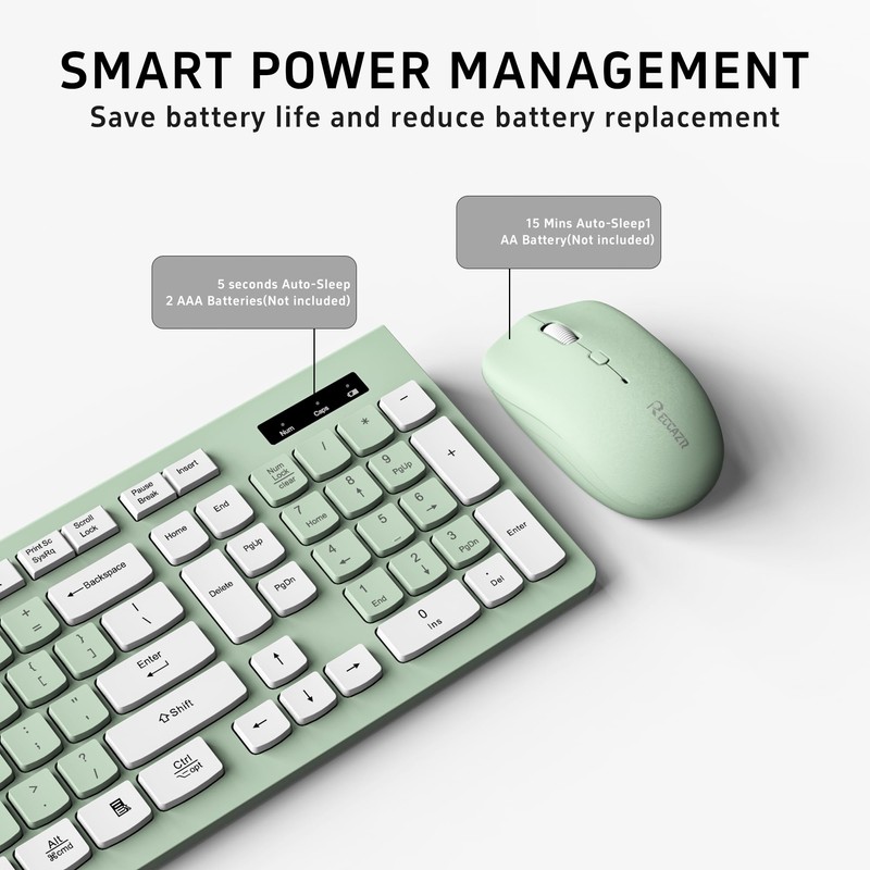 • 【Auto Power Saving Function】Wireless keyboard and mouse have a smart auto-sleep mode to save power. They will enter sleep mode after stop using a while(Refer to the instructions for details). Unplug the receiver or after the PC shutdown, they will enter sleep mode too.You can press any keys to wake. (battery life may vary based on user and computing conditions)