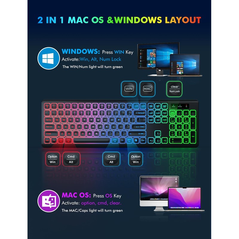 - 👍UNIVERSAL COMPATIBILITY - This backlit keyboard mouse combo works with your PC, Desktop, Laptop or Notebook. Compatible with Windows, Linux, Chrome and Mac. (Note: Multimedia keys may not be fully compatible with Mac OS systems).