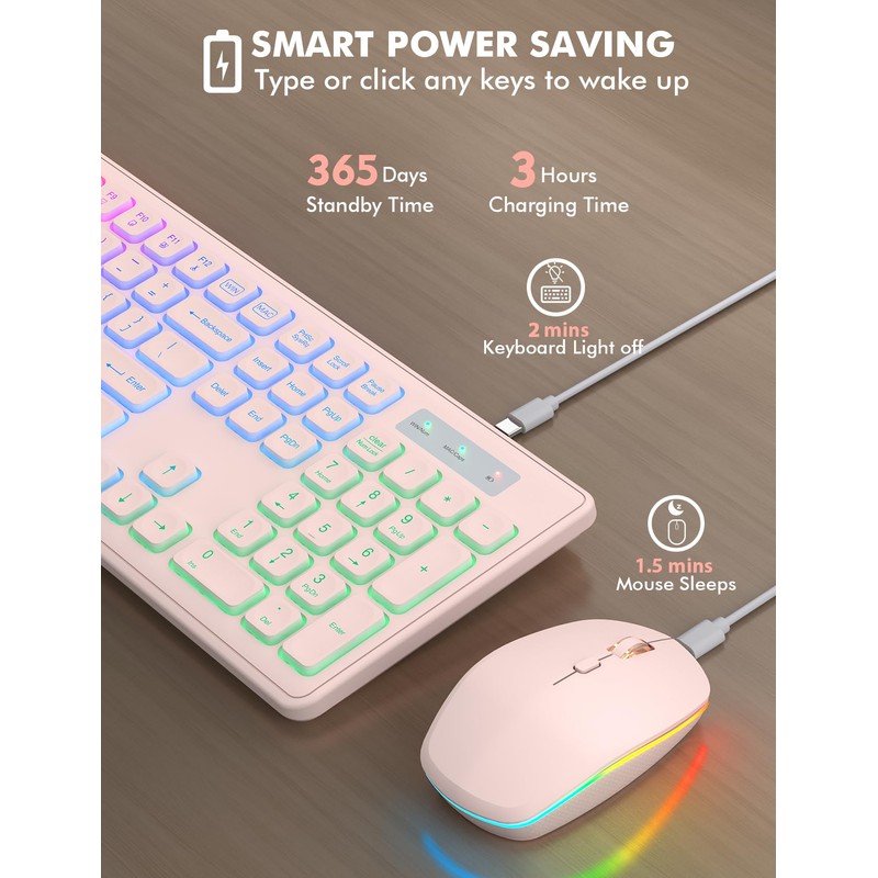 - LONG BATTERY LIFE - Rechargeable keyboard and mouse can be charged by supplied USB C charging cable. The smart auto-sleep function and on/off switches help you to save power. Leave for 30 mins, the keyboard goes to sleep, leave for 90s, the mouse will sleep.