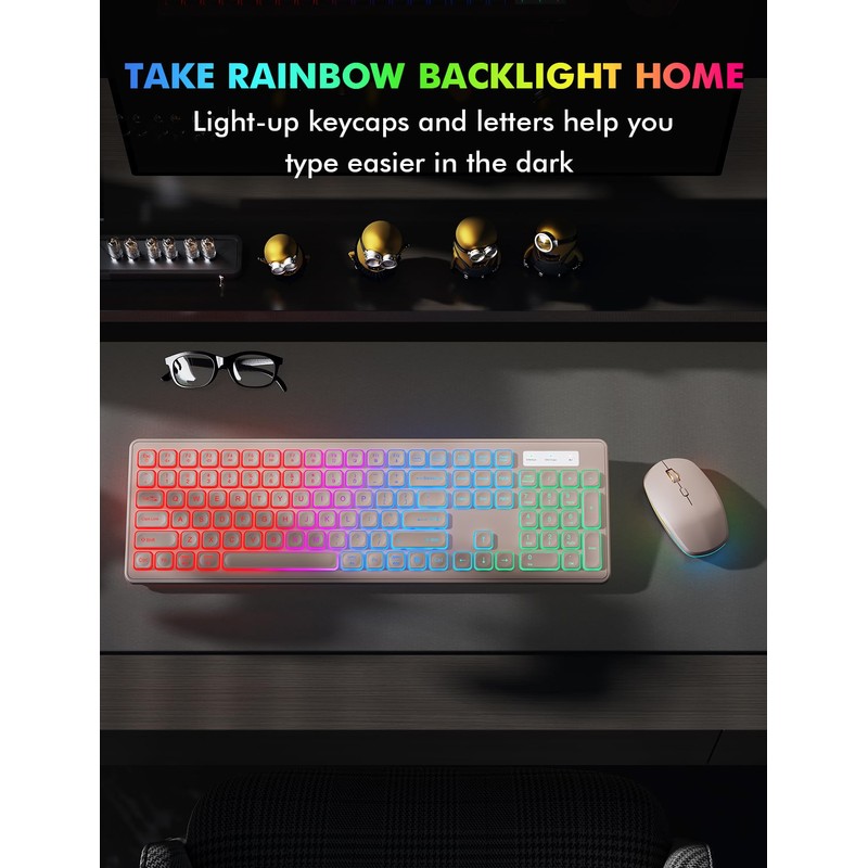 - COOL RGB BACKLIGHT - The keyboard has a rainbow color backlight and 3 adjustable brightness. The mouse has 15 switchable lighting effects. Light-up keycaps and letters help you to use it easier in low light.