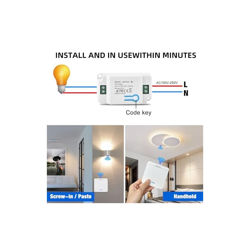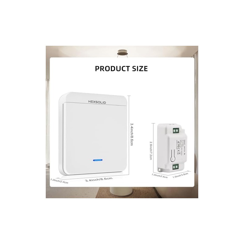 - Easy to Install: The wireless switch has a receiver that can be used over 400,000 times and measures 2.83x 1.5 x 1.02 inch, all that is required to install the receiver is to wire it between the power supply and the fixture and then pair it with the switch. The compact receiver can be hidden in most junction boxes, switch boxes or screwed to a circuit board.