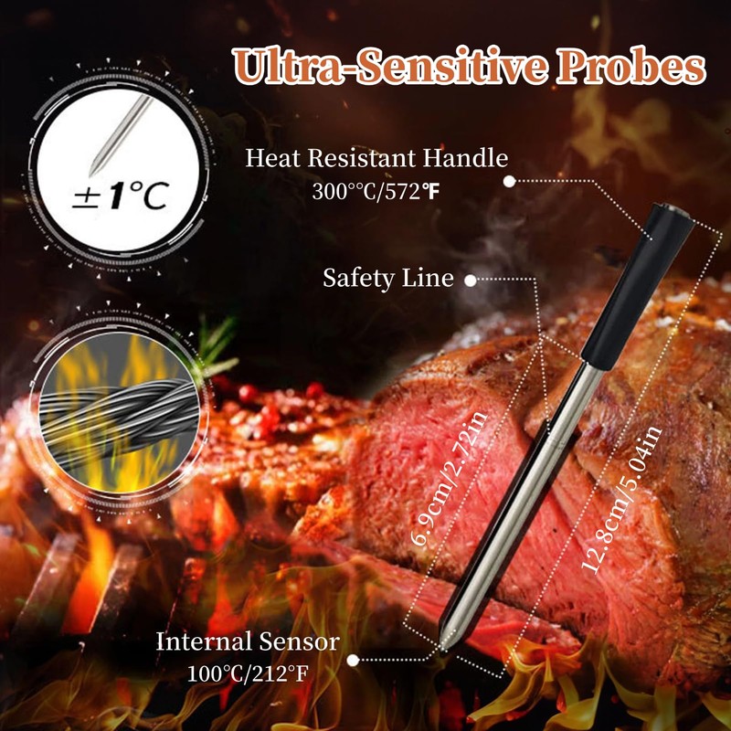 - [Long Battery Life] The thermometer features a 5 minute fast charge and a 4 hour battery life, ensuring you can monitor your cooking for extended periods.