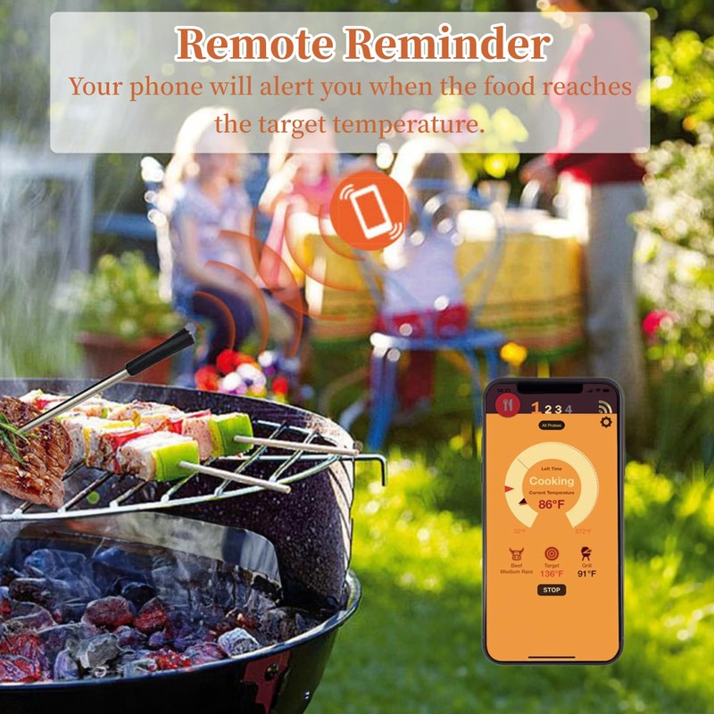 - [Efficient Time Management] The wireless thermometer effectively manages your cooking time and eliminates guesswork with preset cooking times. Your phone will alert you when the food reaches the target temperature, ensuring perfectly cooked meals.