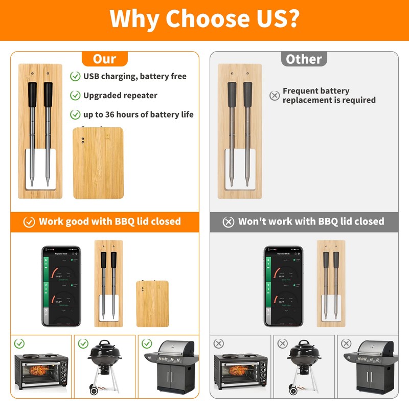 - UPGRADE MEAT THERMOMETER WITH REPEATER: Unlike other's thermometers, our upgraded thermometers include a repeater. Even in a closed cooking environment, the Smart phone can receive signals normally. The repeater can also charge the thermometer(charged for 20 mins and worked up 36 hrs). You can charge the thermometer anytime and anywhere even when you are outdoors, without changing the battery frequently, saving time and cost of buying the battery.
