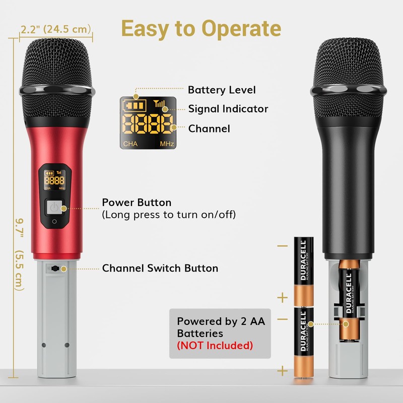 - Easy to Operate: Just turn on the receiver and mics, they will match automatically. Note: It is not compatible with laptop, iPad, cellphone and AV receiver. 2 x AA batteries (not included) are required for each mic.